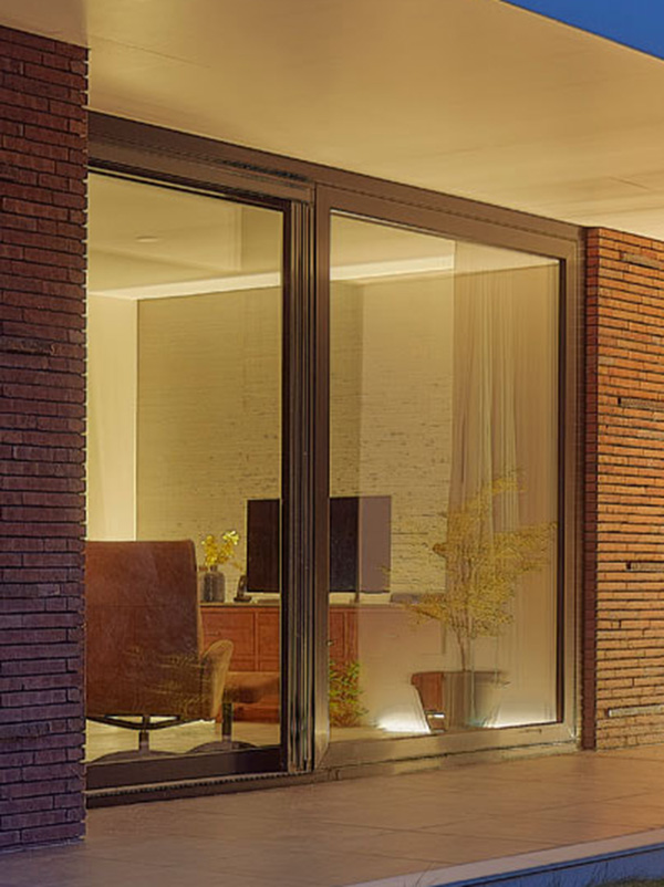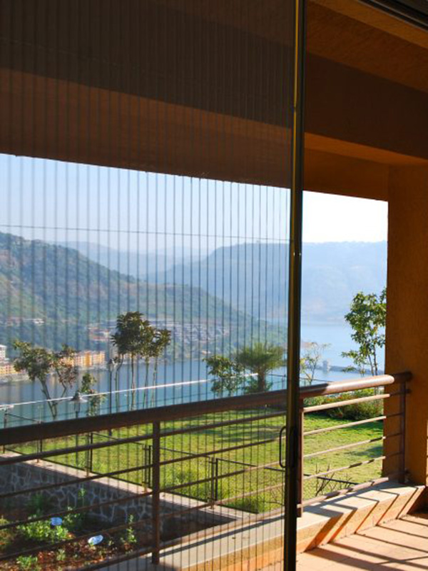 Szélálló, modern árnyékolás nagy üvegfelületekre, amely hatékony védelmet nyújt a napfény és a hő ellen, miközben megőrzi a kilátást.